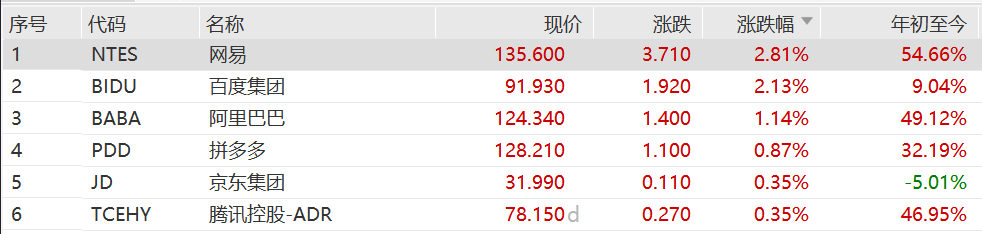 纳斯达克中国金龙指数收涨,中概科技龙头指数涨0.52%。网易、百度集团、阿里巴巴、拼多多纷纷收涨。昨夜拼多多发布二季度财报,单季营收达1040亿元,同比增长7%,盘前一度大涨超10%。